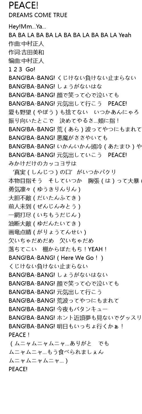 | [01:51.288] | BANG!BA-BANG! 元気出していこう PEACE! |
