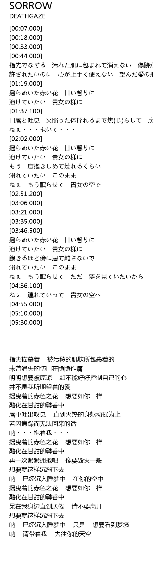 | [00:50.000] | 指尖描摹着 被污秽的肌肤所包裹着的 未曾消失的伤口在隐隐作痛 |