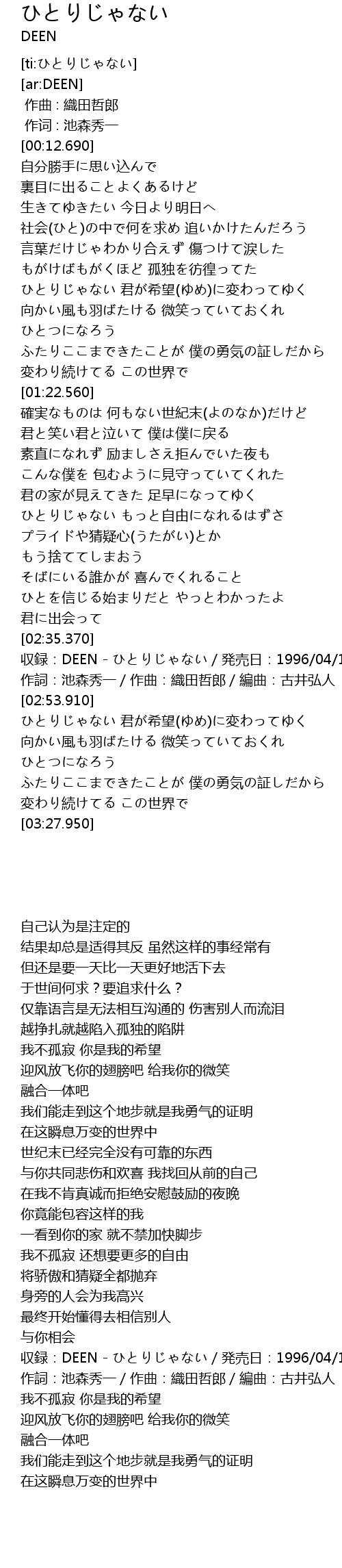 | [02:37.370] | 収録:DEEN - ひとりじゃない/発売日:1996/04/15 |