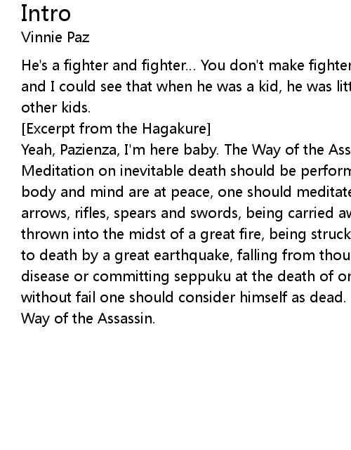 | Yeah, Pazienza, I' m here baby. The Way of the Assassin is found in death. Meditation on inevitable death should be performed daily. Every day when one' s body and mind are at peace, one should meditate upon being ripped apart by arrows, rifles, spears and swords, being carried away by surging waves, being thrown into the midst of a great fire, being struck by lightning, being shaken to death by a great earthquake, falling from thousandfoot cliffs, dying of disease or committing seppuku at the death of one' s master. And every day without fail one should consider himself as dead. This is the substance of the Way of the Assassin. |
