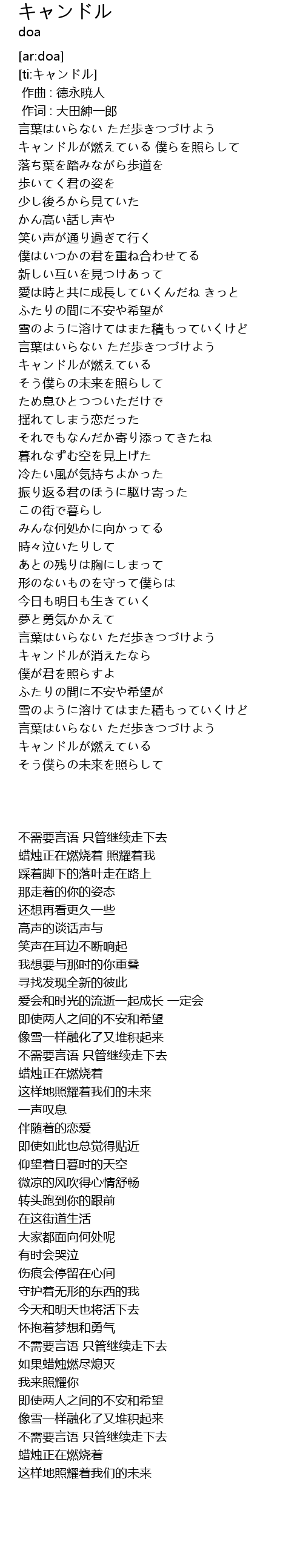 | [00:12.92] | キャンドルが燃えている 僕らを照らして |
