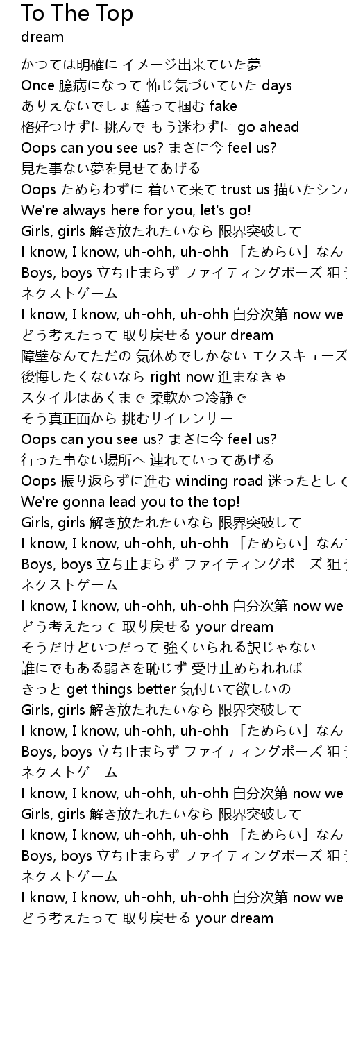 | I know, I know, uh-ohh, uh-ohh 自分次第 now we take you to the top | |