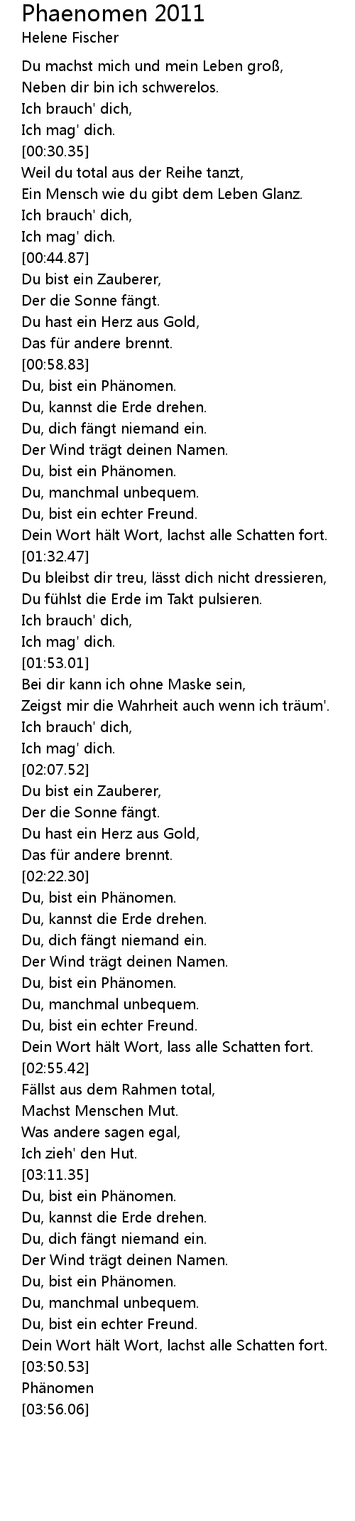 | [03:31.58] | Du, bist ein Phänomen. |