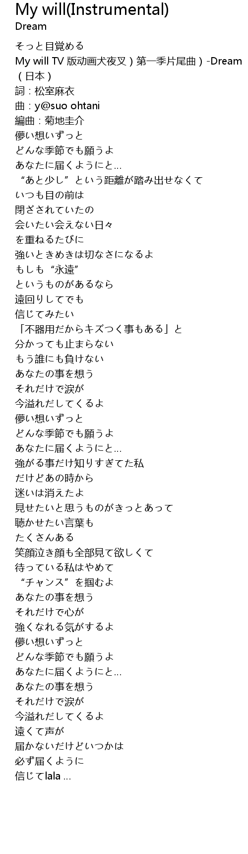 | [00:05.339] | My will TV 版动画犬夜叉)第一季片尾曲)-Dream (日本) |