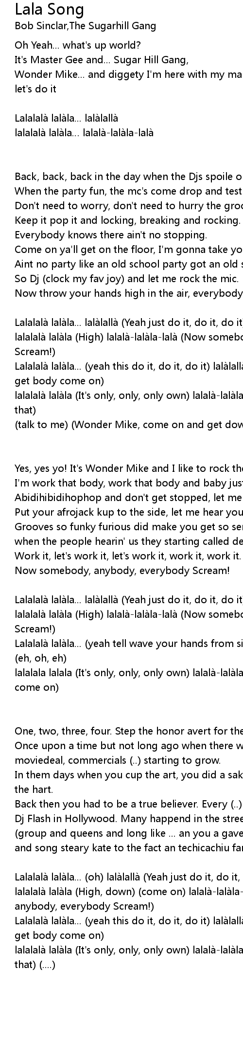 | lalalalà lalàla (High, down) (come on) lalalà-lalàla-lalà (Now somebody, anybody, everybody Scream!) | |