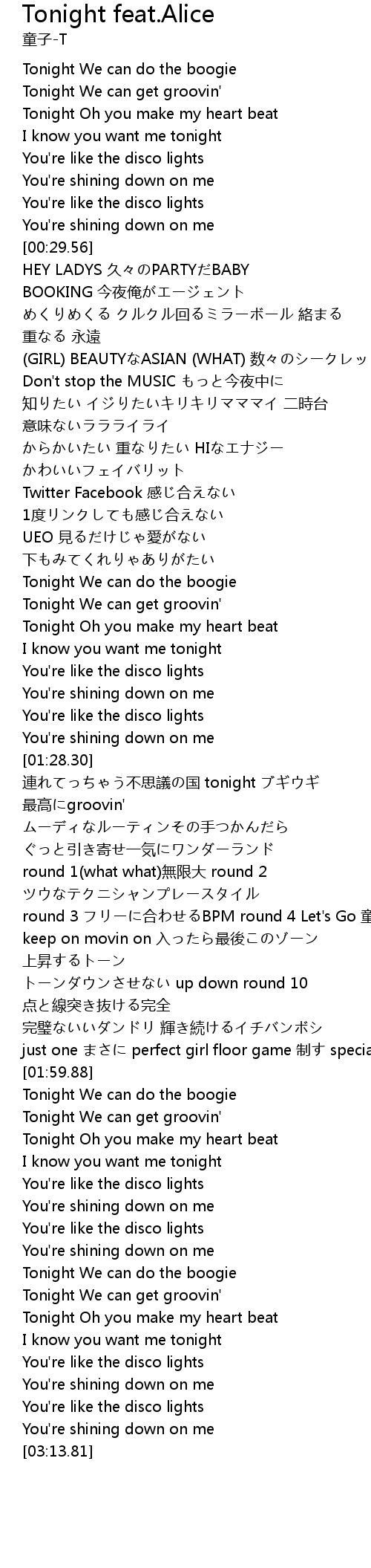 | [01:30.61] | 連れてっちゃう不思議の国 tonight ブギウギ 最高にgroovin' |