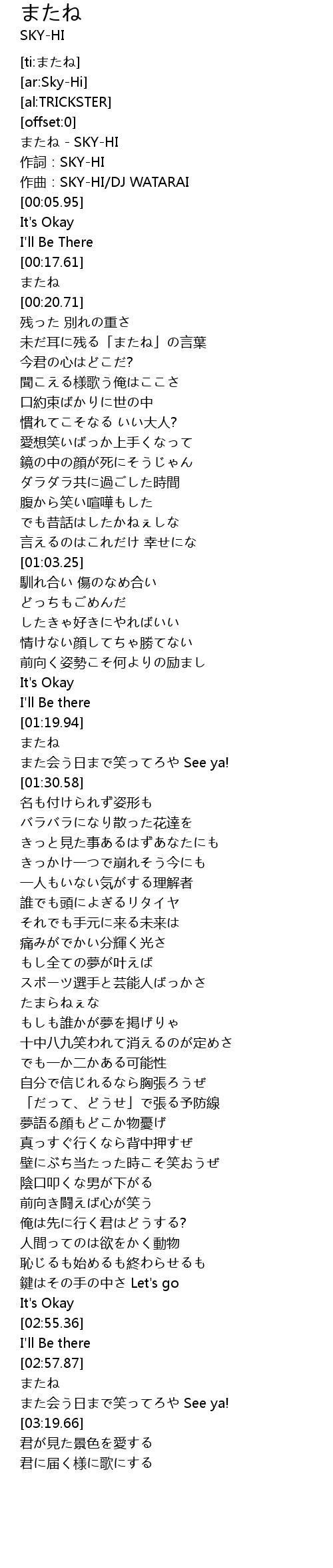 | [00:01.01] | またね - SKY-HI |