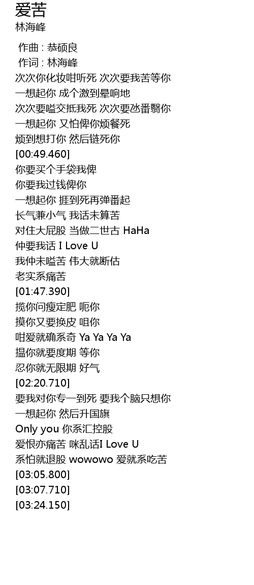 | [02:44.900] | 爱恨亦痛苦 咪乱话I Love U |