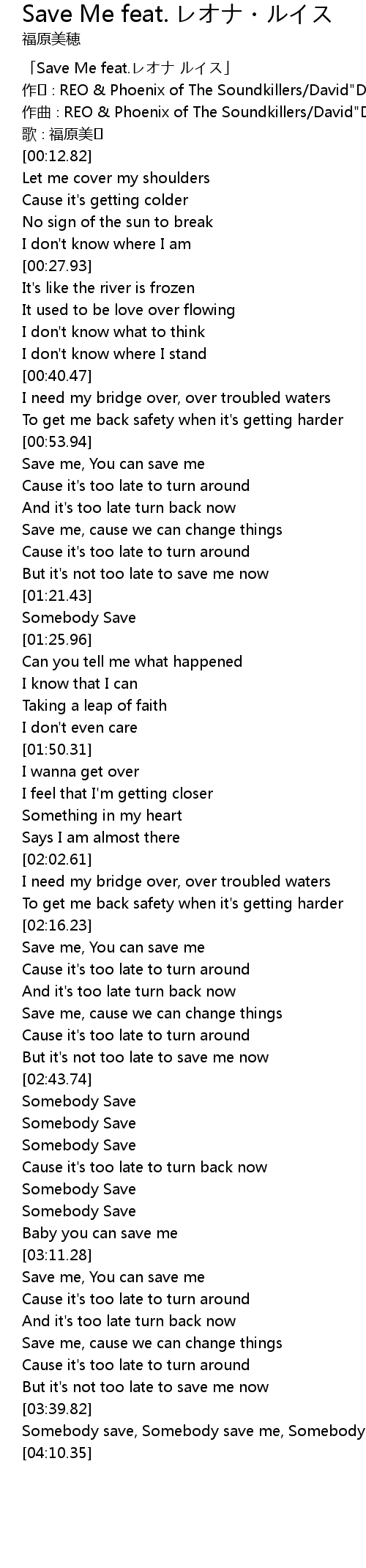 | [00:00.82] | 「Save Me feat.レオナ ルイス」 |