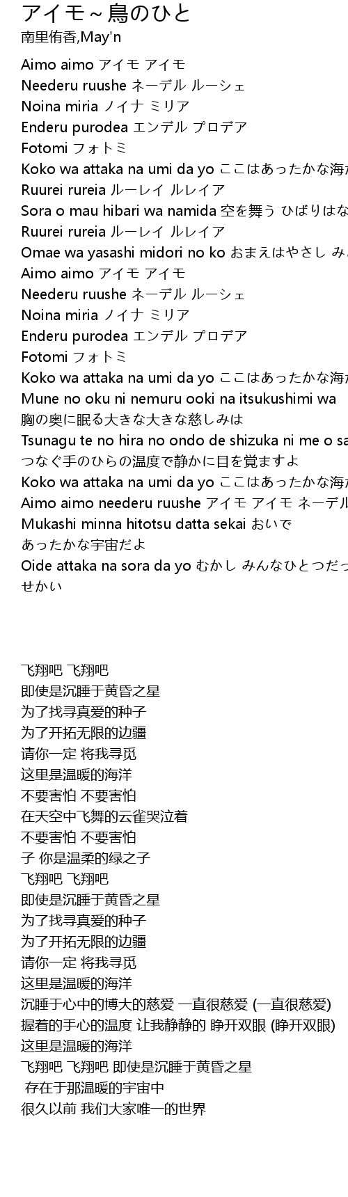 | [02:54.78] | Aimo aimo neederu ruushe アイモ アイモ ネーデル ルーシェ |