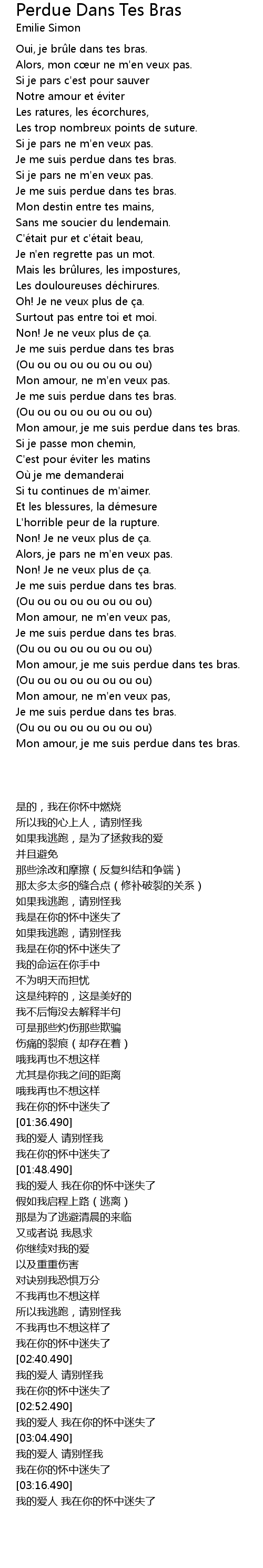 | [02:31.490] | Je me suis perdue dans tes bras. |