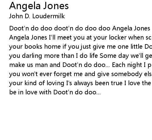 Doot'n do doo doot'n do doo doo Angela Jones Doot'n do doo doot'n do doo doo Angela Jones I'll meet you at your locker when school's dismissed I'll carry your books home if you just give me one little Doot'n do doo... You know I love you darling more than I do life Some day we'll get some preacher and let him make us man and Doot'n do doo... Each night I pray to heaven way up above That you won't ever forget me and give somebody else your Doot'n do doo... I love your kind of loving I's always been true I love the way you whisper I'll always be in love with Doot'n do doo... |