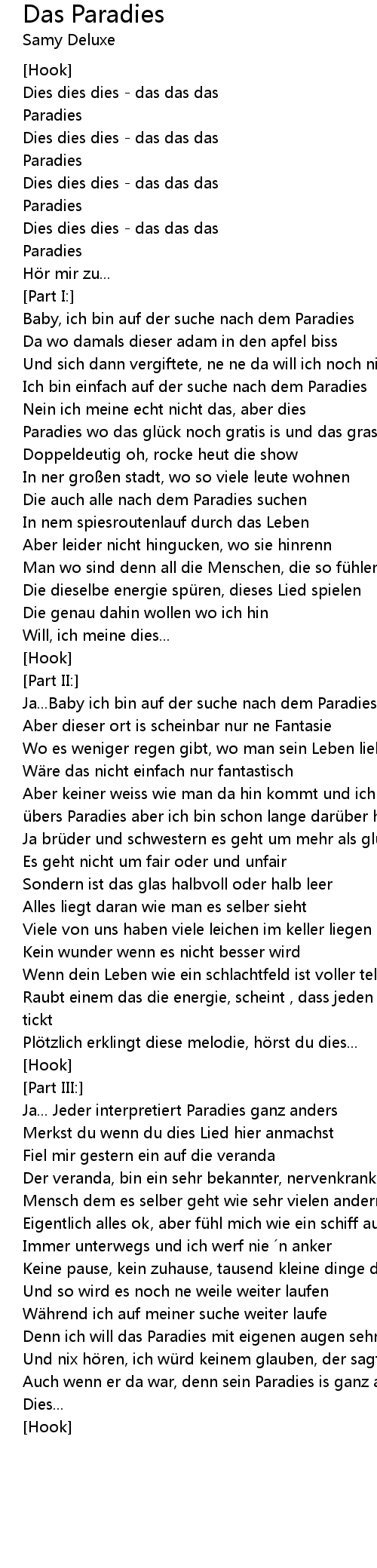 | Paradies wo das glü ck noch gratis is und das gras noch sprie t | |