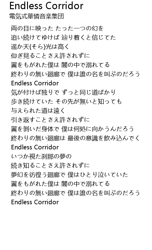 | [03:32.270] | 終わりの無い廻廊で 僕は誰の名を叫ぶのだろう |
