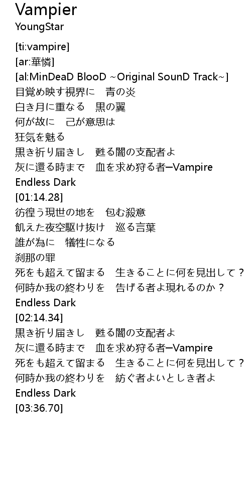 | [02:57.93] | 灰に還る時まで 血を求め狩る者─Vampire |