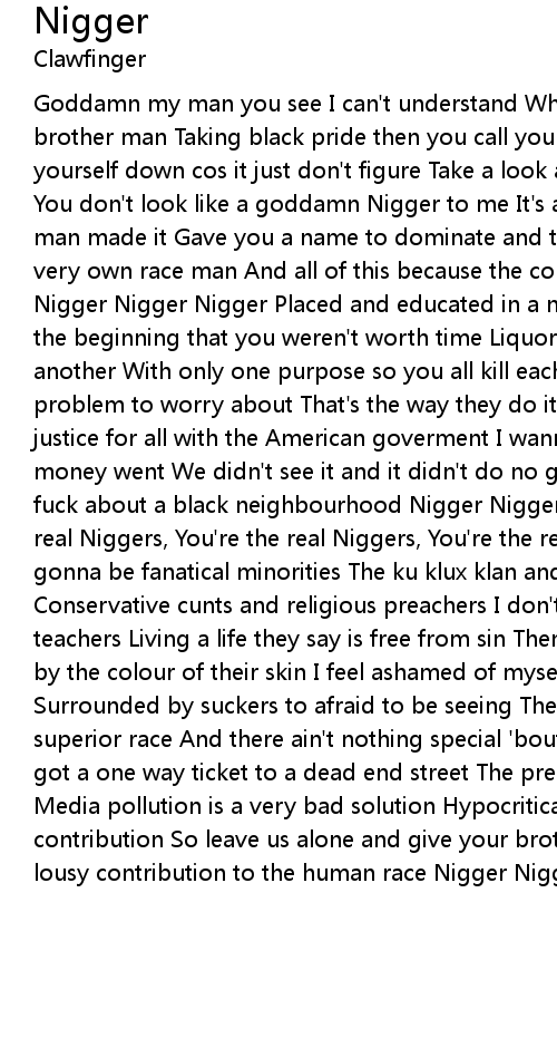 Goddamn my man you see I can't understand Why you wanna say Nigger to your brother man Taking black pride then you call yourself a Nigger Don't bring yourself down cos it just don't figure Take a look at yourself and your history You don't look like a goddamn Nigger to me It's a negative world and the white man made it Gave you a name to dominate and trade it Making blood money of his very own race man And all of this because the colour of your face man Nigger Nigger Nigger Nigger Placed and educated in a neighbourhood of crime Taught from the beginning that you weren't worth time Liquorstore and gunstore next to one another With only one purpose so you all kill each other Leaving one less problem to worry about That's the way they do it this is how it turns out And justice for all with the American goverment I wanna know where all the goddamn money went We didn't see it and it didn't do no good I guess you couldn't give a fuck about a black neighbourhood Nigger Nigger Nigger Nigger Nigger You're the real Niggers, You're the real Niggers, You're the real Niggers There's always gonna be fanatical minorities The ku klux klan and fucked up authorities Conservative cunts and religious preachers I don't care cos they ain't our teachers Living a life they say is free from sin Then they judge another person by the colour of their skin I feel ashamed of myself I'm a white human being Surrounded by suckers to afraid to be seeing There ain't such a thing called superior race And there ain't nothing special 'bout colour of your face You've got a one way ticket to a dead end street The pressure is on so feel the heat Media pollution is a very bad solution Hypocriticat hype is your only contribution So leave us alone and give your brothers some space Cos you're a lousy contribution to the human race Nigger Nigger ... |