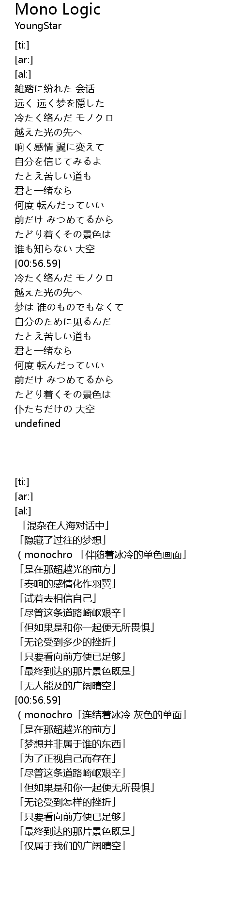| [01:07.49] | (monochro「连结着冰冷 灰色的单面」 |