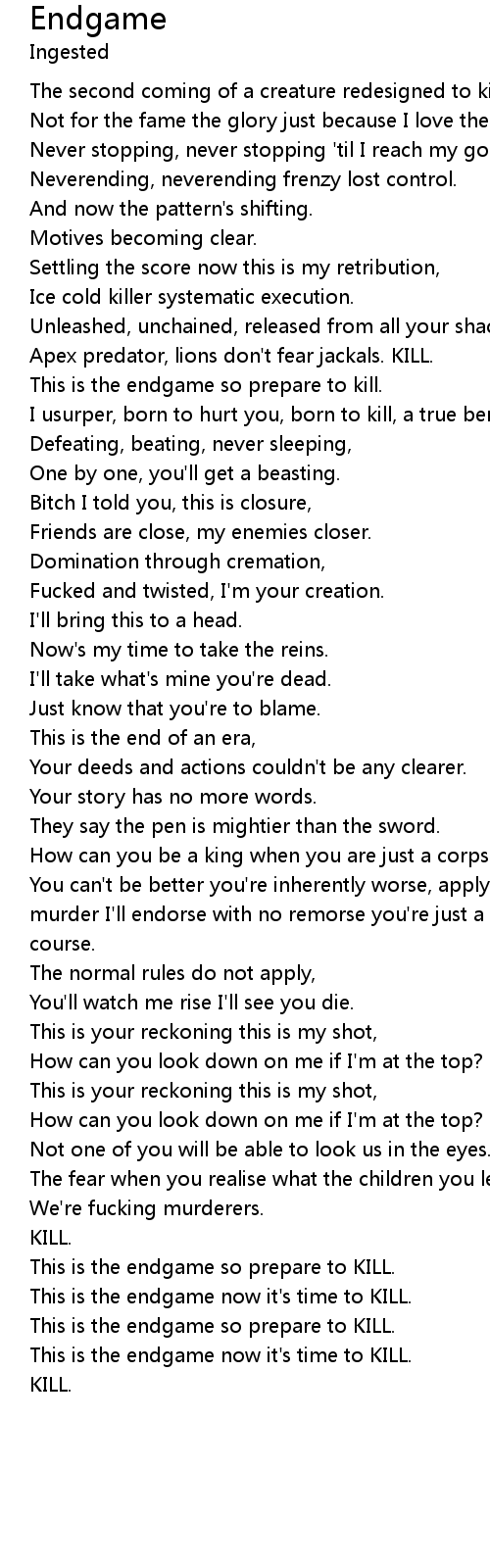 You can't be better you're inherently worse, applying force to the source, your murder I'll endorse with no remorse you're just a morsel bitch and I'm the main course. |