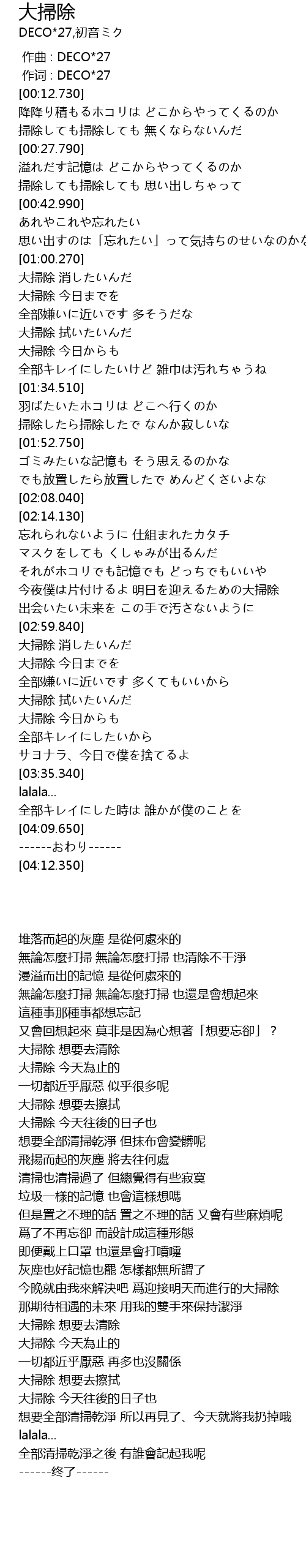 | [03:20.270] | 大掃除 拭いたいんだ |