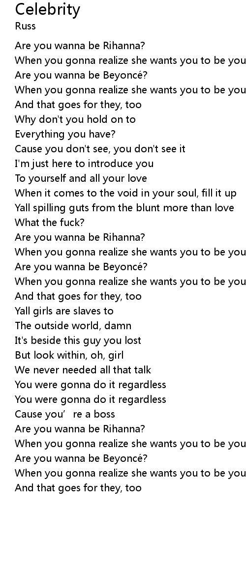 | [00:22.485] | Are you wanna be Beyonce? |