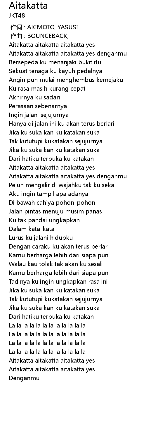 | [00:13.24] | Aitakatta aitakatta aitakatta yes denganmu |
