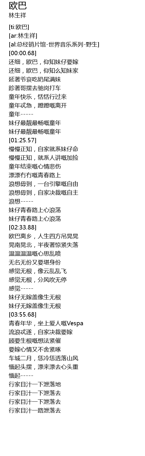 | [02:55.59] | ōu bā lí xiāng, rén shēng sì fāng diào huàng huǎng |