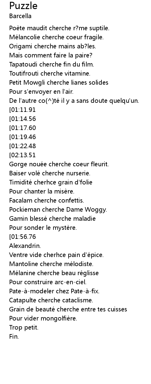 | [00:43.29][01:22.48][02:11.43][02:30.97] | Nos vies sont des puzzles chinois |