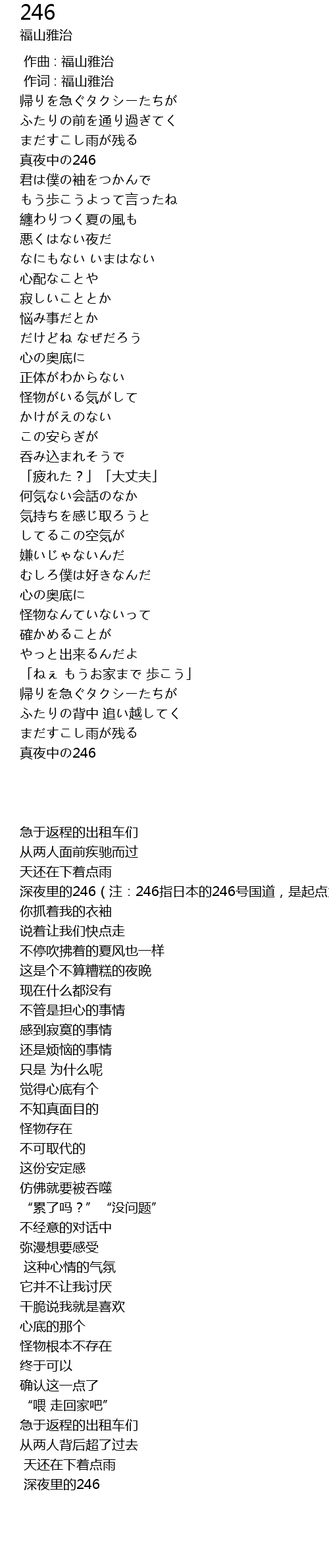 | [00:43.98] | 深夜里的246(注:246指日本的246号国道,是起点为东京千代田区,终点为静冈县沼津市的一条公路) |