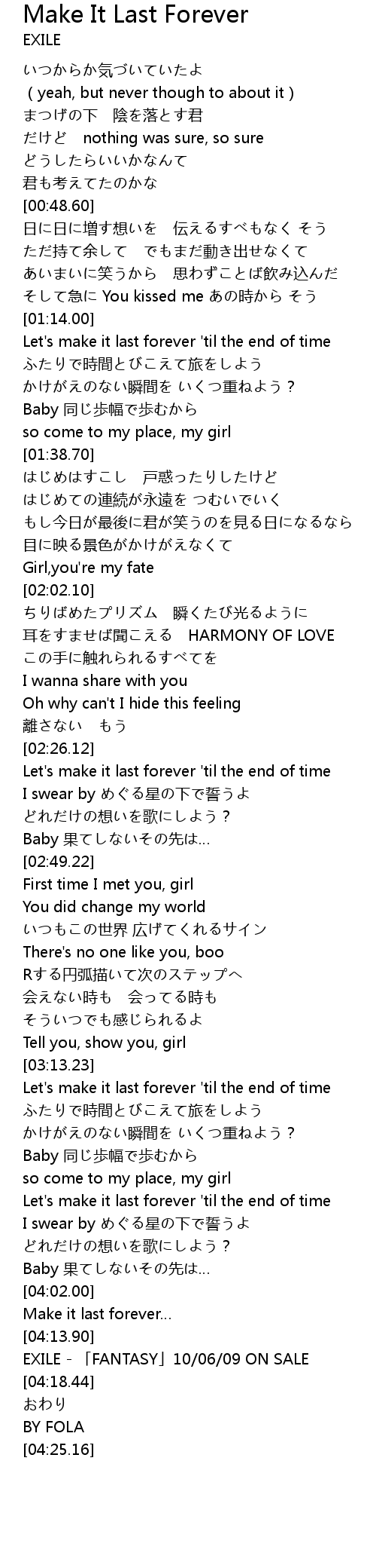 | [03:14.24] | Let's make it last forever 'til the end of time |