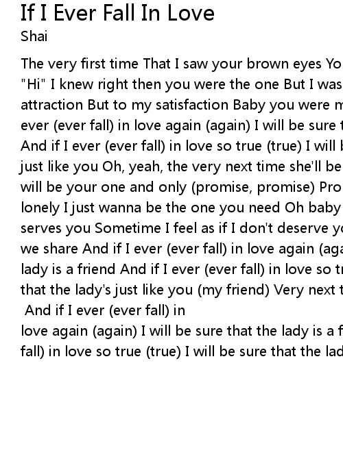 The very first time That I saw your brown eyes You only said "Hello" And I said "Hi" I knew right then you were the one But I was caught up In physical attraction But to my satisfaction Baby you were more than just a face And if I ever (ever fall) in love again (again) I will be sure that the lady is a friend And if I ever (ever fall) in love so true (true) I will be sure that the lady's just like you Oh, yeah, the very next time she'll be my friend If I say that I will be your one and only (promise, promise) Promise that you'll never leave me lonely I just wanna be the one you need Oh baby I just wanna be the one who serves you Sometime I feel as if I don't deserve you I cherish every moment that we share And if I ever (ever fall) in love again (again) I will be sure that the lady is a friend And if I ever (ever fall) in love so true (true) I will be sure that the lady's just like you (my friend) Very next time she will be my friend Someone who I can believe in (my friend) [repeat] And if I ever (ever fall) in love again (again) I will be sure that the lady is a friend And if I ever (ever fall) in love so true (true) I will be sure that the lady's just like you |
