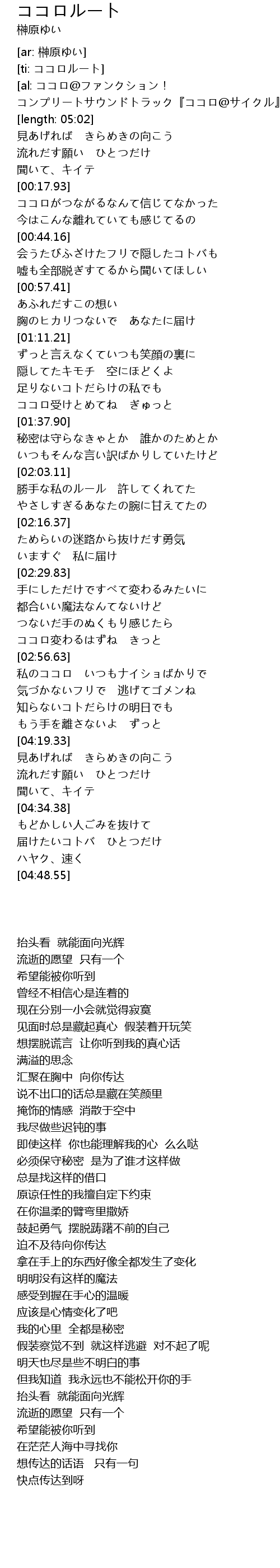 | [01:03.41] | 胸のヒカリつないで あなたに届け |