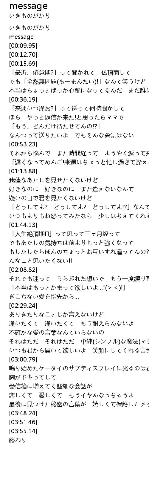 | [03:36.95] | 最後に見つけた秘密の言葉が 嬉しくて保護したメッセージ |