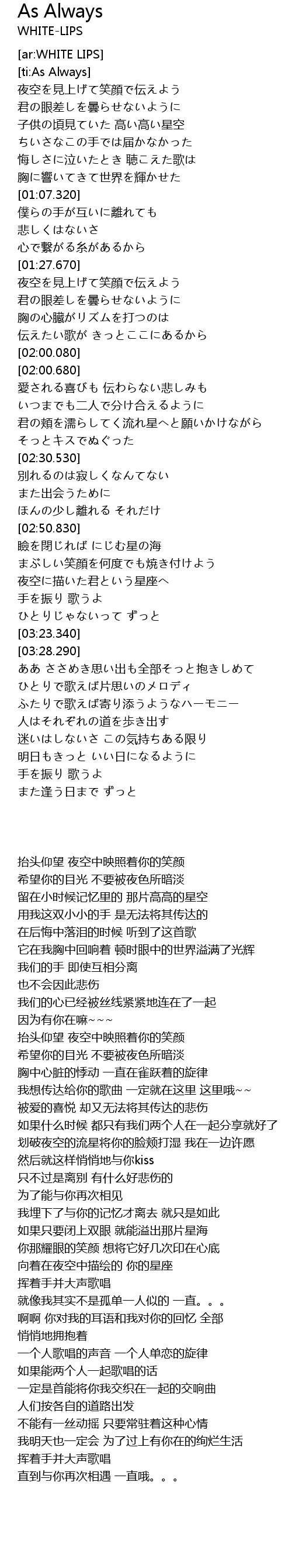 | [02:16.580] | 划破夜空的流星将你的脸颊打湿 我在一边许愿 |