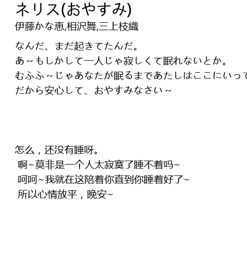 | [00:12.88] | だから安心して、おやすみなさい~ |