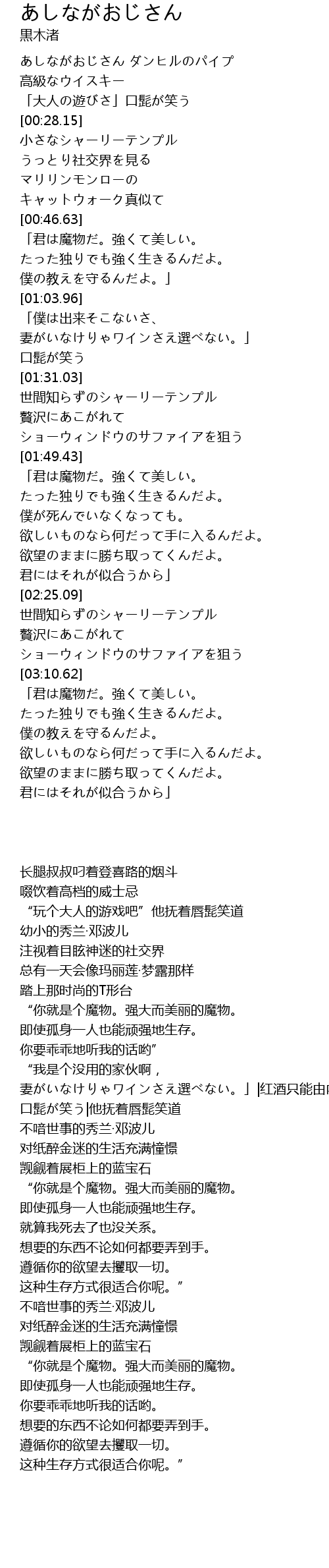 | [00:20.48] | 「大人の遊びさ」口髭が笑う |
