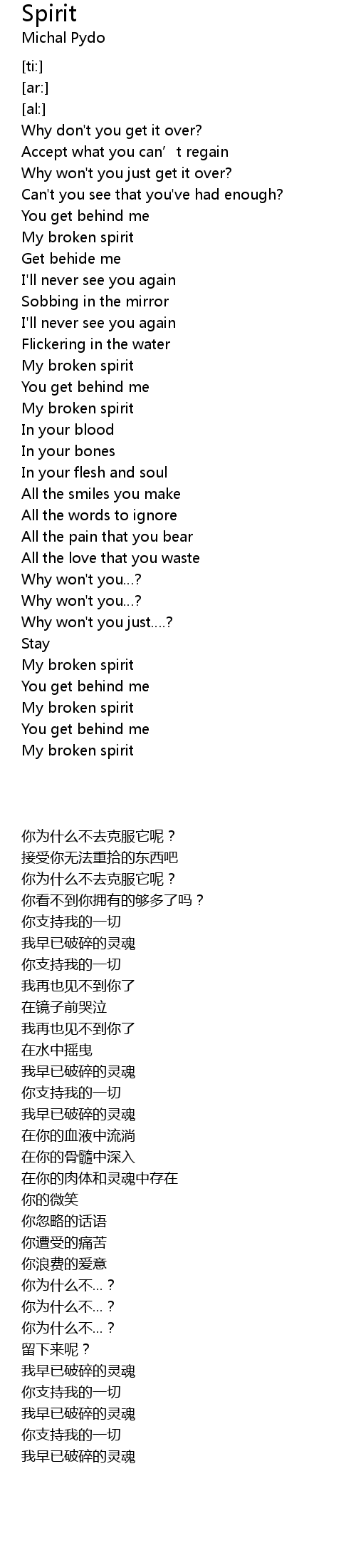 | [02:25.80] | My broken spirit |