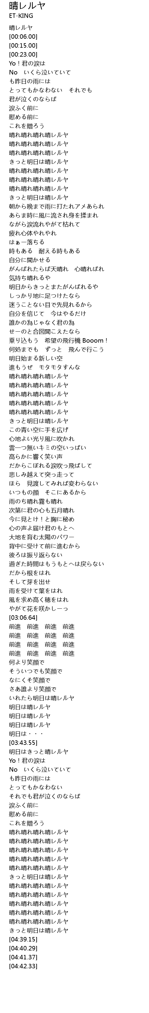 | [04:19.53] | 晴れ晴れ晴れ晴レルヤ |