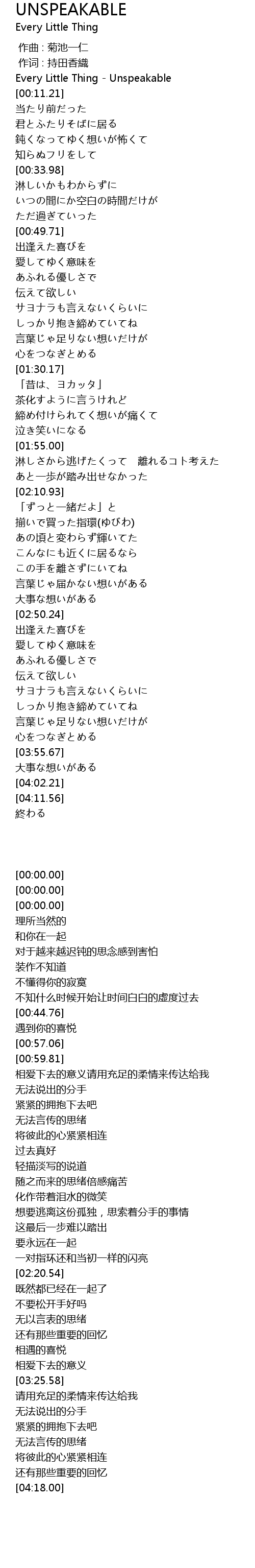 | [00:00.00] | Every Little Thing - Unspeakable |