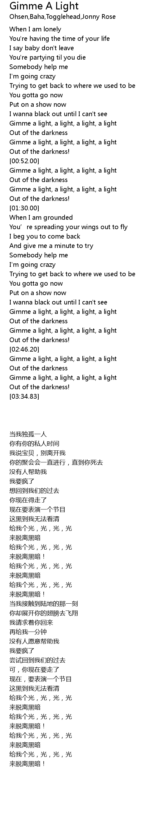 | [03:22.43] | Gimme a light, a light, a light, a light |
