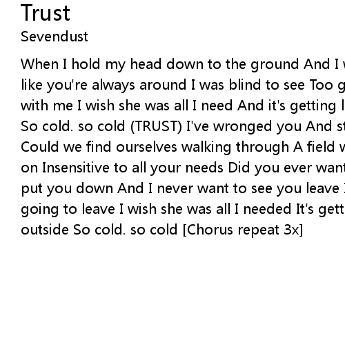 When I hold my head down to the ground And I wish you were here with me Seems like you're always around I was blind to see Too good to be true you can't stay with me I wish she was all I need And it's getting late. and it's cold outside So cold. so cold (TRUST) I've wronged you And steal everything from the truth Could we find ourselves walking through A field with no solitude The pain goes on Insensitive to all your needs Did you ever want to stay with me Never try to put you down And I never want to see you leave I still can't believe you're going to leave I wish she was all I needed It's getting late and it's cold outside So cold. so cold [Chorus repeat 3x] |