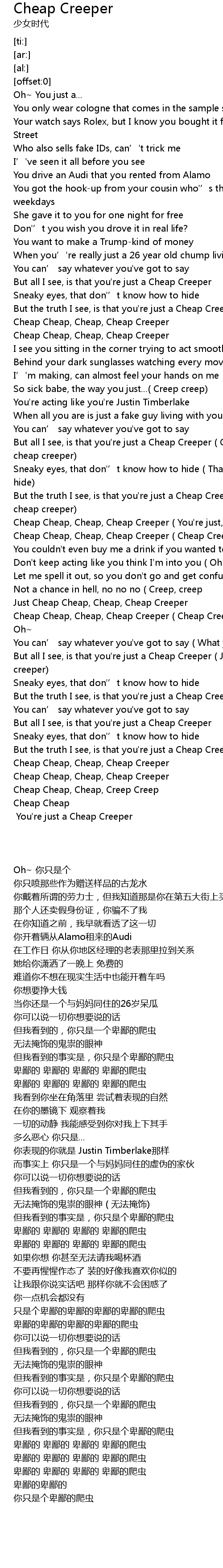 | [01:47.33] | Cheap Cheap, Cheap, Cheap Creeper ( You're just, you're just) |
