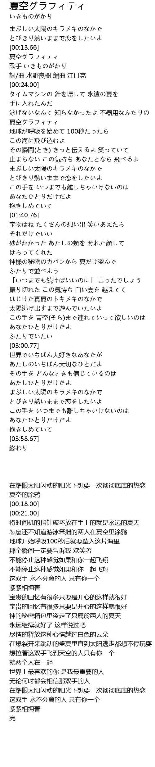| [00:36.78] | 泳げないなんて 知らなかったよ 不器用なふたりの 夏空グラフィティ |
