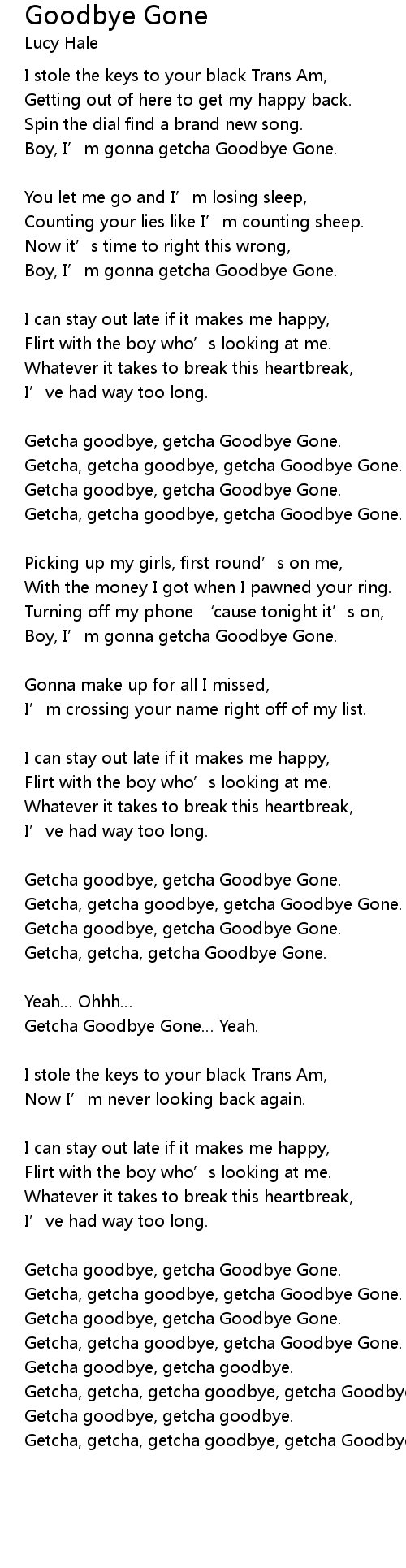 | Getcha, getcha, getcha goodbye, getcha Goodbye Gone. |