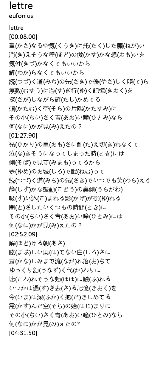 | [01:37.42] | 光(ひかり)の重(おも)さに耐(た)え切(き)れなくて |