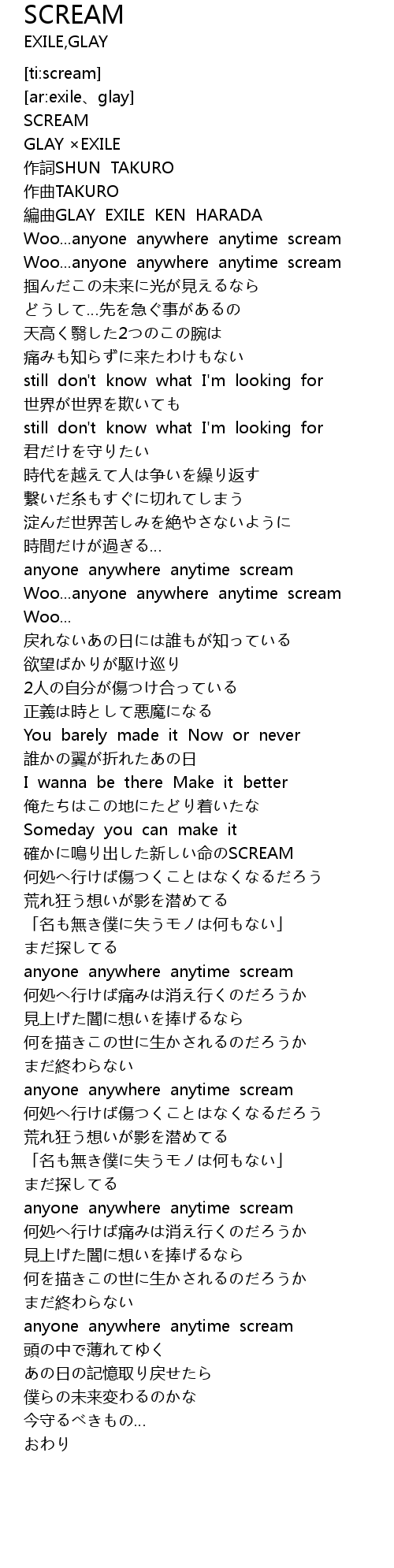 | [01:16.281] | Woo... anyone anywhere anytime scream |