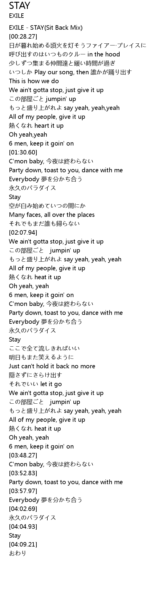 | [00:00.00] | EXILE STAY Sit Back Mix |