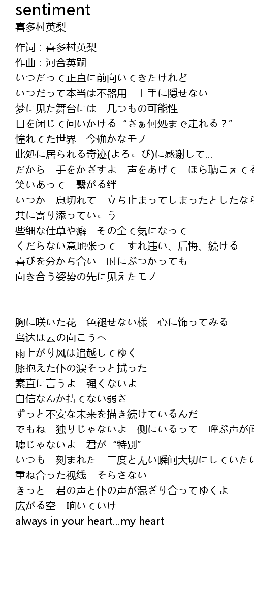 | いつも 刻まれた 二度と无い瞬间大切にしていたいよ | |