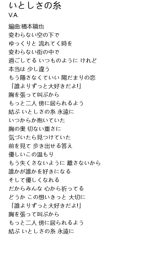 | [03:51.37] | 結ぶ いとしさの糸 永遠に |