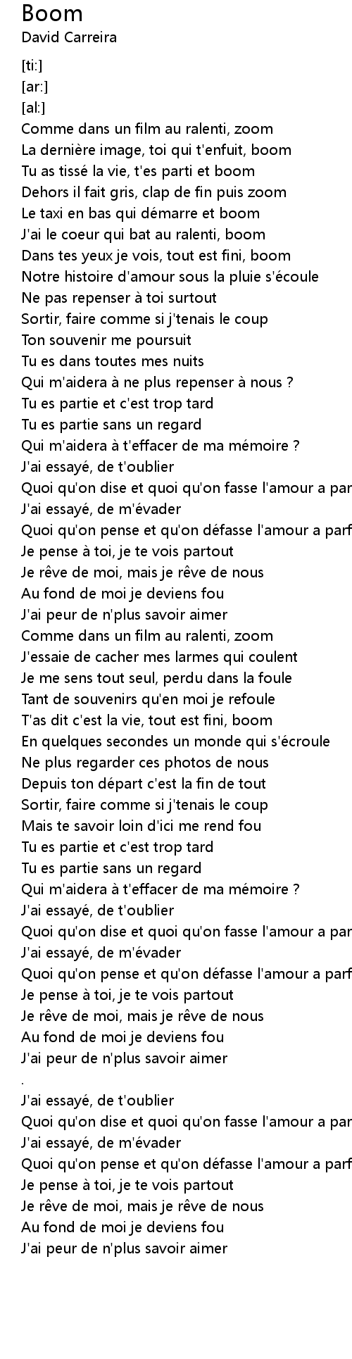| [00:22.02] | Dans tes yeux je vois, tout est fini, boom |