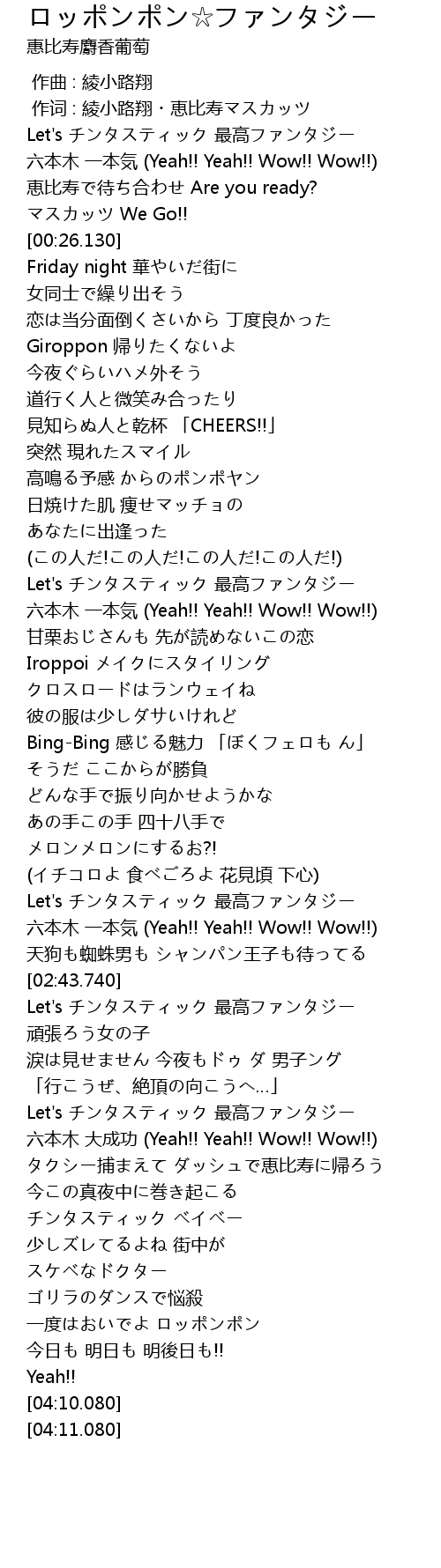 | [03:25.080] | 六本木 大成功 (Yeah!! Yeah!! Wow!! Wow!!) |